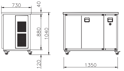 Capacidade útil de 2 barris KEG Ø 425 mm Dimensões: L/D/H 1.350/730/1.050 mm É possível fazer publicidade no balcão mediante um custo adicional!